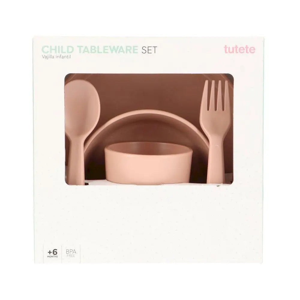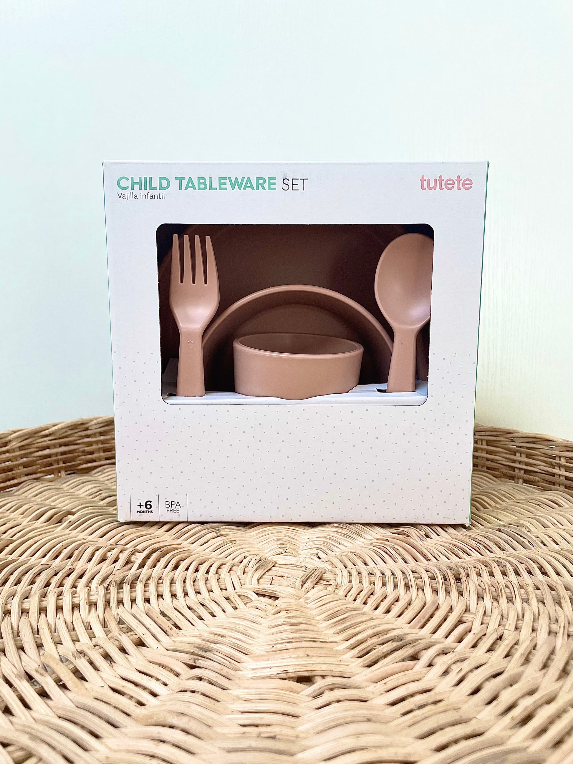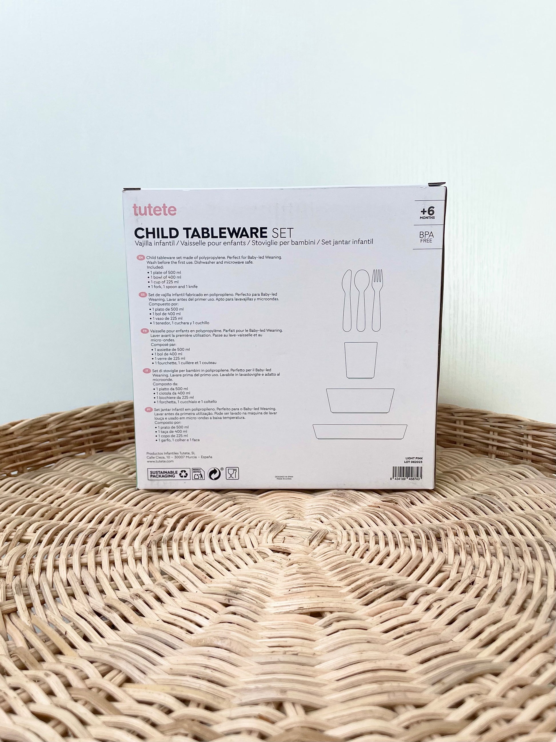Set de vaisselle composé de : cuillère, couteau, fourchette et 1 assiette 1 bol 1 verre